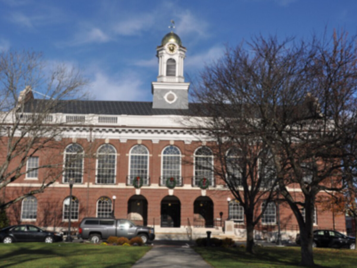 Image by User:Magicpiano from Wikimedia Commons. Needham Town Hall marks the beginning of the parade route.
