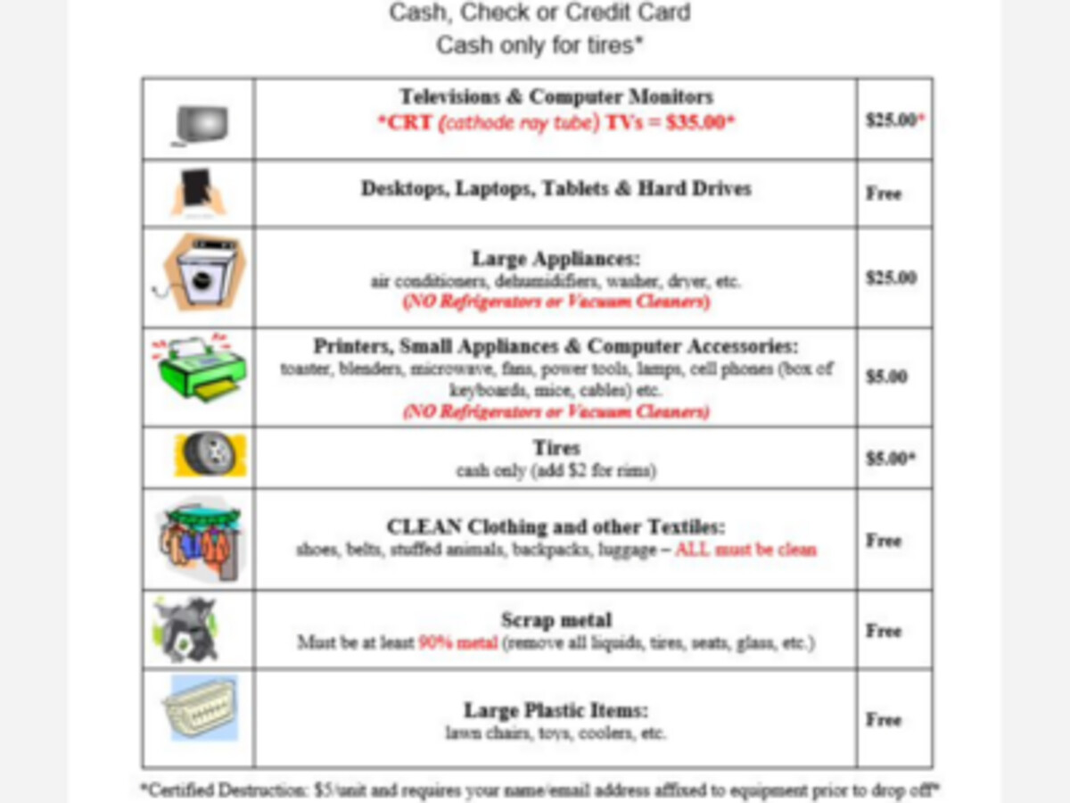 Desktops and laptops hard drives, clean textiles (including backpacks and luggage), large plastic items, and scrap metal (at least 90 percent metal) will be accepted for free.