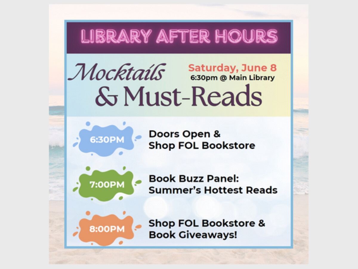 Doors will open at 6:30pm! Browse the Friends of the Library Bookstore and purchase to your heart's content, enjoy a selection of mocktails and snacks, and peruse our Summer Reading Guide for recommendations to add to your TBR list.
