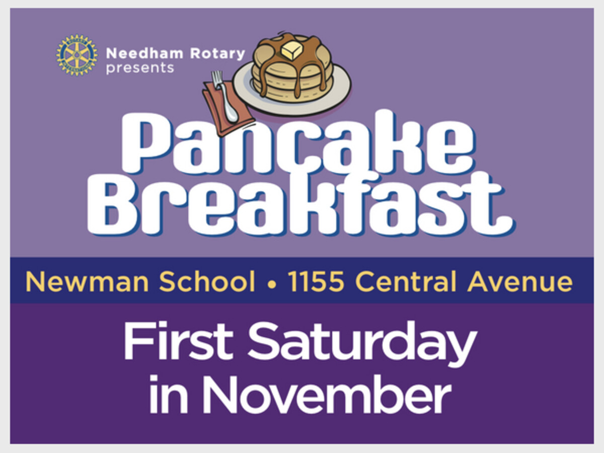 This year's Needham Rotary Pancake Breakfast will be on Saturday, November 2 from 8:00 AM to 11:00 AM at Newman Elementary School in Needham. All you can eat pancakes, sausages, and drinks for $5.