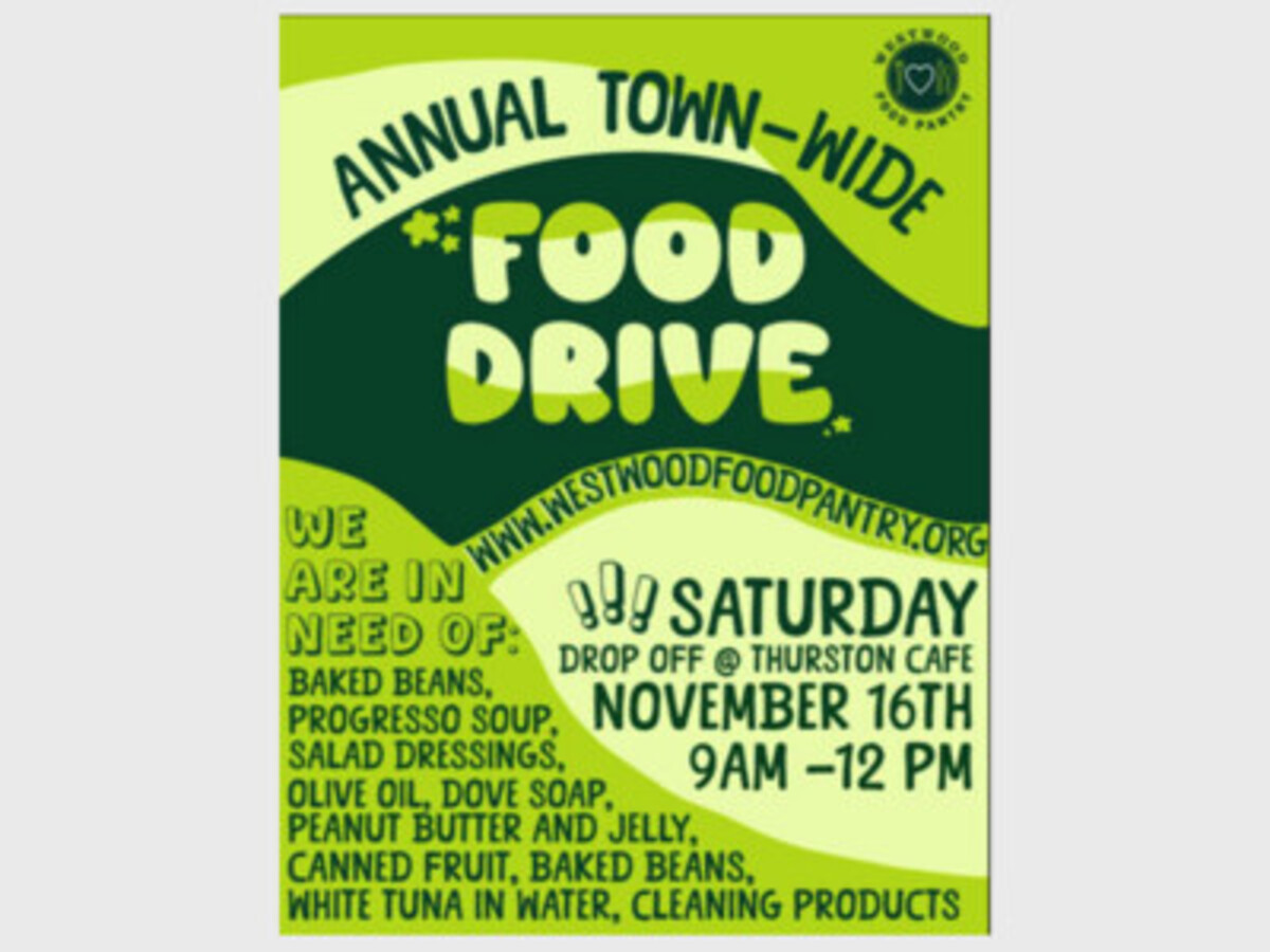 Drop off your non-perishable food donations to help re-stock the Westwood Food Pantry! Collection at the Thurston Middle School runs from 9:00 a.m. to noon.