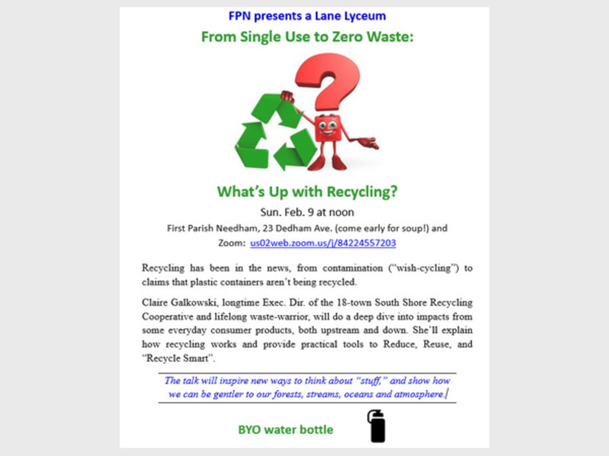 Recycling has been in the news, from contamination problems to assertions that our plastic containers aren’t being recycled. Recycling propfessional Claire Galkowski will do a deep dive into impacts from some everyday consumer products, both upstream and down. She will explain how recycling works and provide practical tools to Reduce, Reuse, and “Recycle Smart”.
