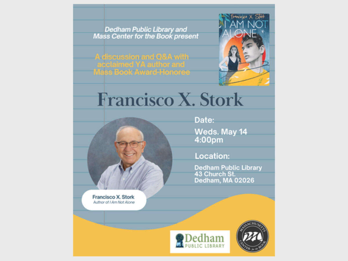 Join the Dedham Public Library for a conversation with Mass Book Award-Honoree Francisco X. Stork, who is the author of the acclaimed YA novel, I Am Not Alone! Stork’s page-turning thriller will appeal to anyone who has struggled to find their place in the world and offers insights into navigating mental health, love and community.