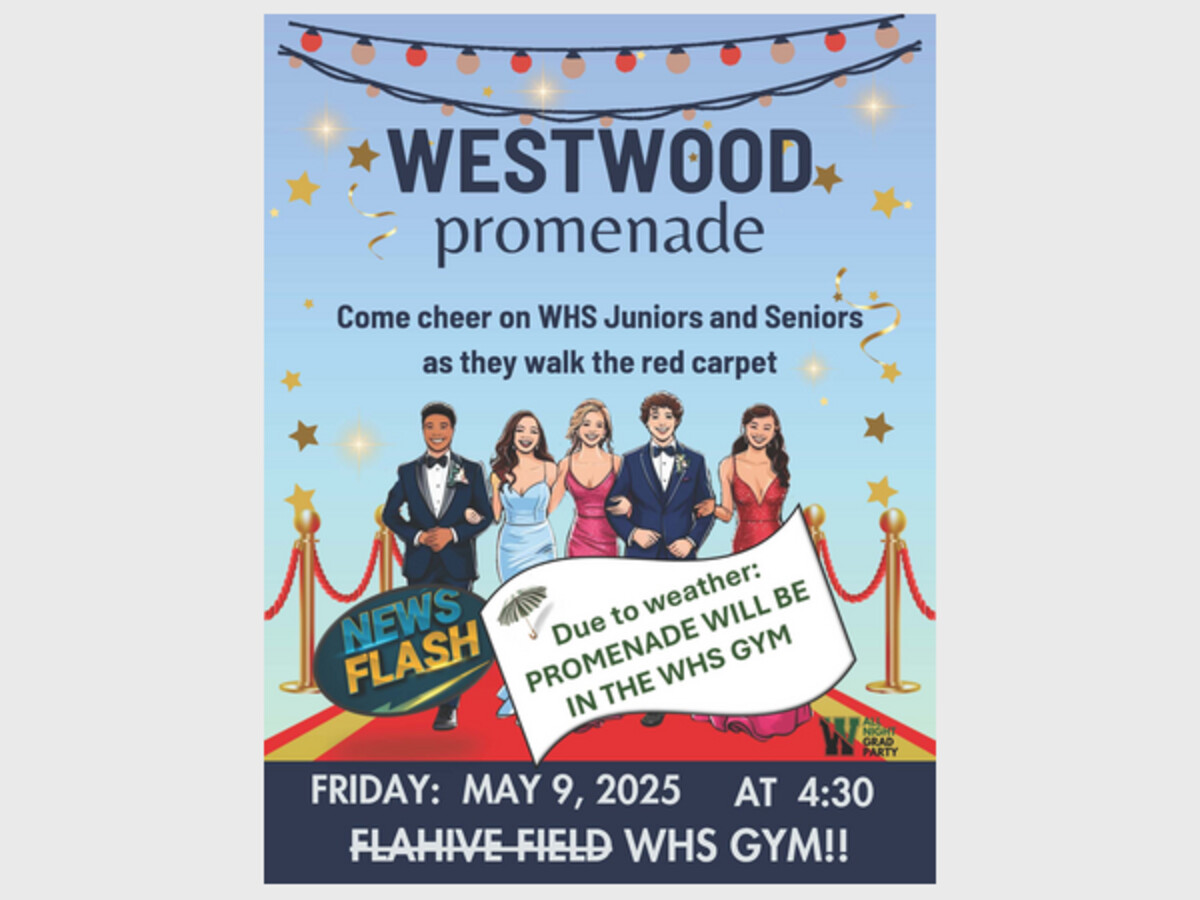Come cheer on WHS juniors and seniors at before they board buses to head out for this year's prom! The Promenade will be held INSIDE WHS gym and begin at 4:30 p.m.