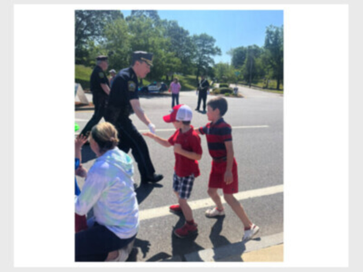 Photo courtesy of Westwood Police Department. Westwood Police Chief Jeffrey Silva shares a high-five with a young spectator as Westwood Police make their way down High Street in Westwood's Memorial Day Parade on May 29, 2023.