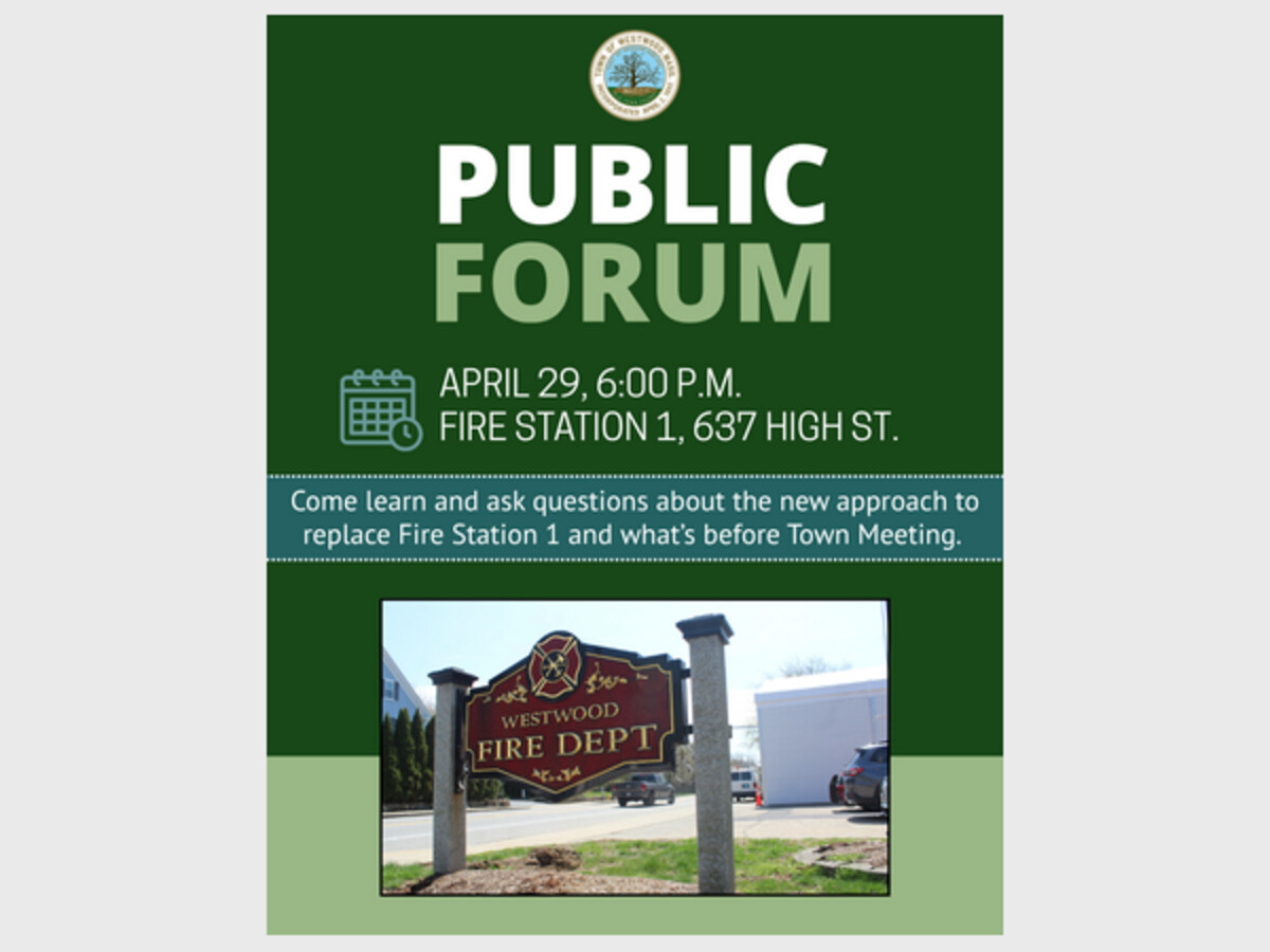 There will be a public forum on the Fire Station 1 project on April 29 at 6 p.m. inside Fire Station 1 (637 High Street). The purpose of this forum is to give residents an opportunity to ask questions and learn about the new approach to replace FS1 ahead of the May 4 Town Meeting.