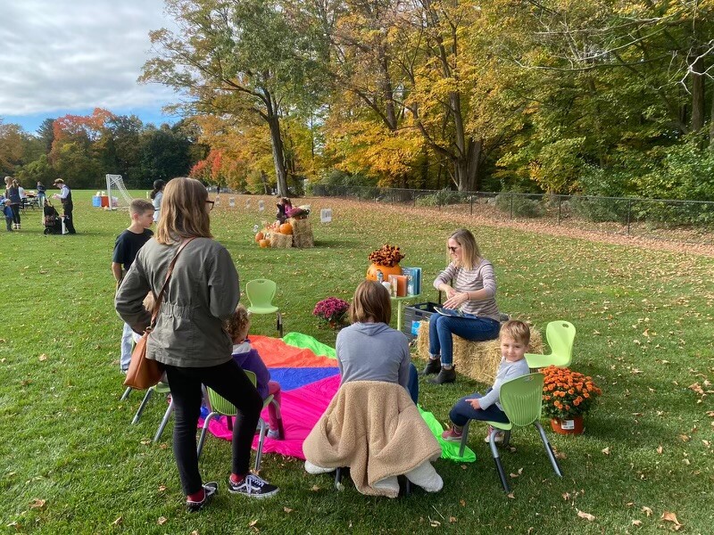 Photo by Jennifer Flanders / Westwood Young Women's Club. It's story time, as children gather in a circle of chairs around a story teller.Harvestfest Committee Chair Sara Gill adds, “Several local businesses were eager to sponsor Harvestfest this year, and the committee raised about 30% more in sponsorship revenue than last year. This support has been instrumental in shaping this year’s event.”