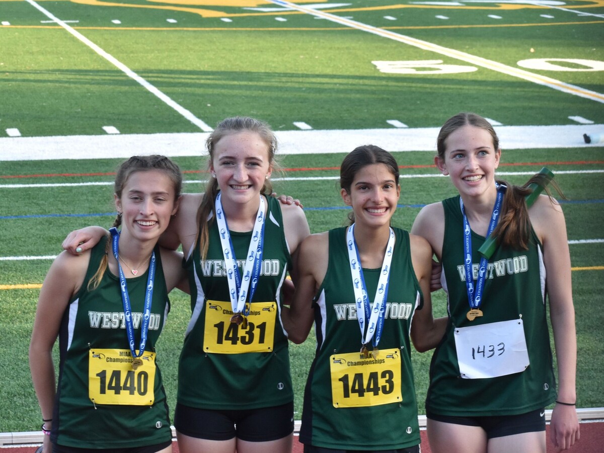 Photo by Bridget O'Sullivan, courtesy of Westwood Track and Field. Tea Pagnotti (center) takes the handoff of the baton from 4x400 meter relay teammate Olivia O'Neill.The names of many of the athletes in this group now appear on two or more new school records. Ruby Codrington and Olivia O’Neill lead the stellar pack, each with four school records to their names. But the performances of any of the nine record-holders are nothing short of historic for WHS.