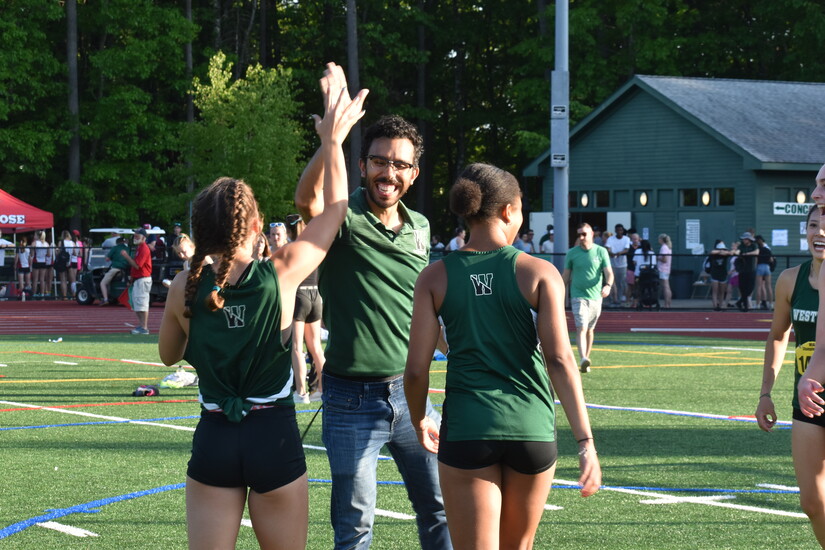 Photo by Bridget O'Sullivan, courtesy of Westwood Track and Field. Moments after their record-breaking sprint, Harper Morrison (left) gives a high-five to Head Coach Raul Madera, in the company of Ruby Codrington.Breaking school records was a goal of this team. Girls Distance Coach Jen Teahan notes that the athletes had “goal-setting discussions around the record board and they worked to get their names displayed on it.”