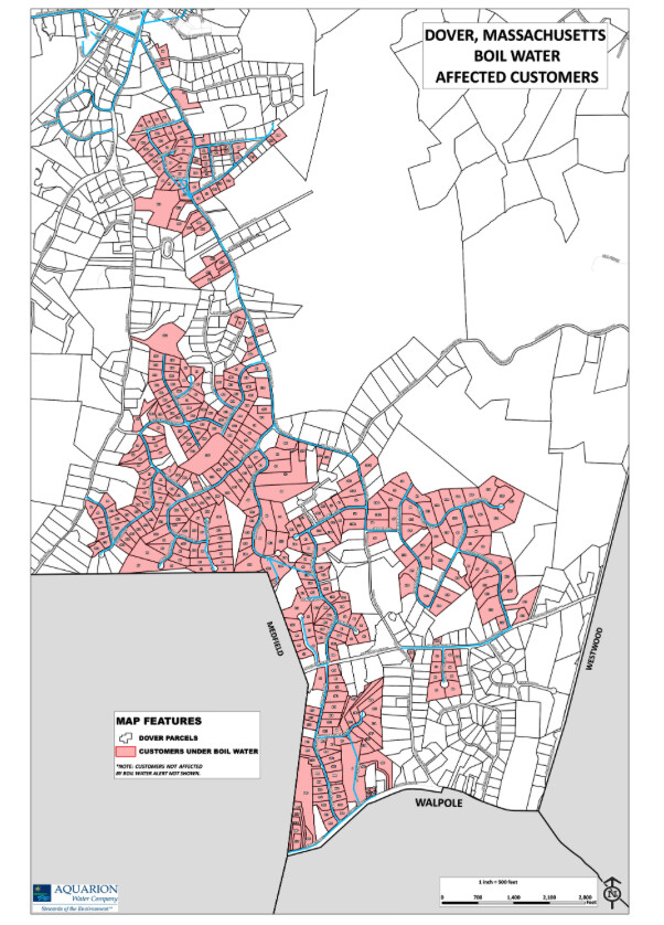 Image from Town of Dover website. This map shows in color the location of specific drinking water customers who are affected by Aquarion Water Company's boil water alert.Aquarion explained that while performing maintenance on a well, an unspecified emergency at one of three Francis Street wells required taking the wells and Aquarion's treatment plant offline. This resulted in no water or low water pressure.