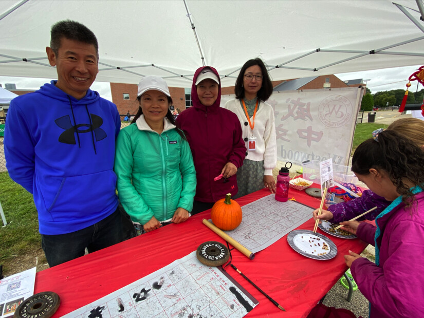Photo by Westwood Minute/Darlene Wong Cancell.Representatives from Westwood Chinese School provide a hands-on experience for booth visitors who are invited to try Chinese calligraphy and chopsticks skills. Pictured (left to right) are Forrest Teng, Principal Jieping Li, Xianli Wang, and Liang Yuan. On the far right, two young ladies take a stab at picking up small beans with chopsticks.