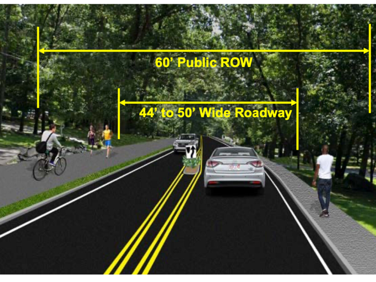 According to Johnathan Rockwell, a member of TEC, the consulting firm hired by the Town of Westwood, the proposed Canton corridor design includes two lanes in opposite directions that are each 14 feet wide. Between the two lanes would be a 6 foot wide, landscaped median. On the west side of Canton Street, a 5.5 foot wide sidewalk would line one lane. On the east side of Canton Street, a 3.5 foot wide buffer zone would line the other lane. Next to that buffer zone would be 10 foot wide shared use path. The path could be used by bicyclists, vehicles coming in and out of residential driveways, and pedestrians.