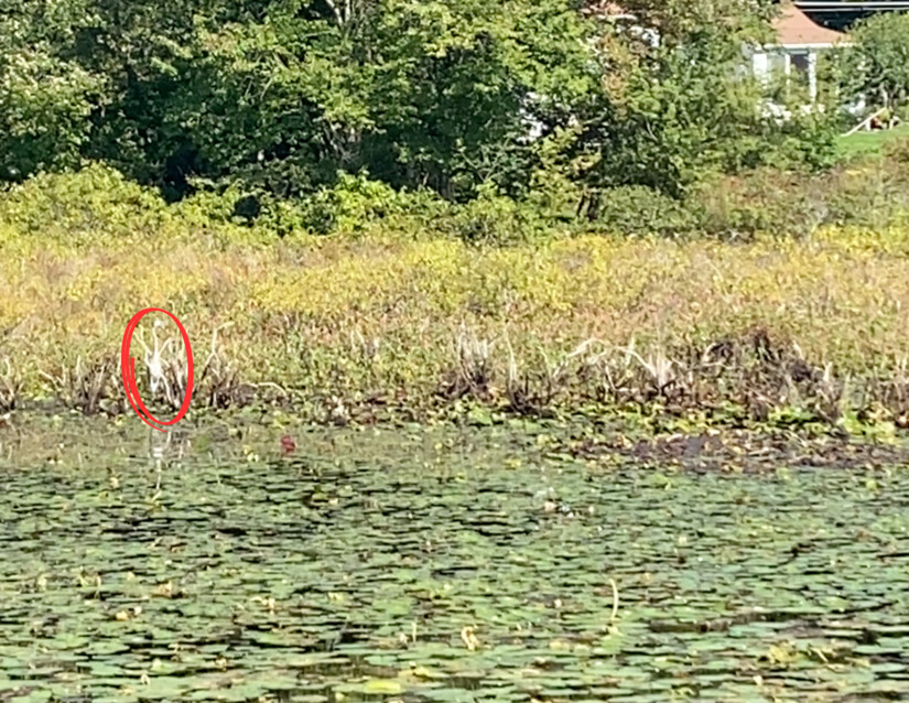 Until the bird makes a movement by turning its head, it looks just like a branch of vegetation growing in a swampy area. And in case you didn't catch the movement, below is the same Westwood Minute Puzzler photo of the bird, with its location circled in red.
