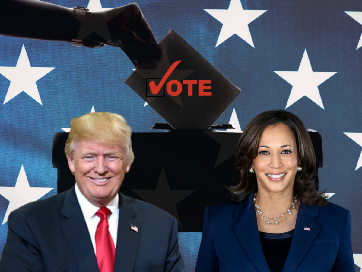Photo Credit: Images of Donald Trump (left) by Gage Skidmore via Flickr; Image of Kamala Harris (right) from GPA Photo Archive via Flickr. Photos have been modified by changing backgrounds and cropping.