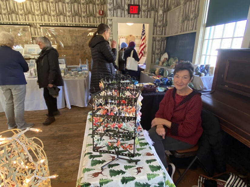 Photo by Westwood Minute/Darlene Wong Cancell. Kathy O'Donnell loves returning to the space of the historic Fisher School for Westwood Artist events.Ms. O’Donnell’s display of around 40 items could represent well over 100 hours of work, she says. She tries to offer a new design each year. This time, her new origami design is a poinsettia.