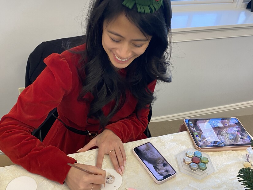 Self-taught watercolor artist Elidi of Lidibug Studio demonstrated her skills by painting a commissioned ornament, while she staffed her table of wares of ornaments and dishtowels, all decorated with her original artwork.