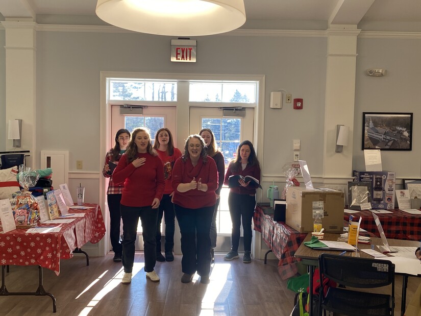 Photo by Westwood Minute/Darlene Wong Cancell. The a cappella group, MassAppeal, pictured here at First Parish of Westwood, visited all three locations of Westwood's Holiday Walkabout, sharing both traditional and contemporary carols.