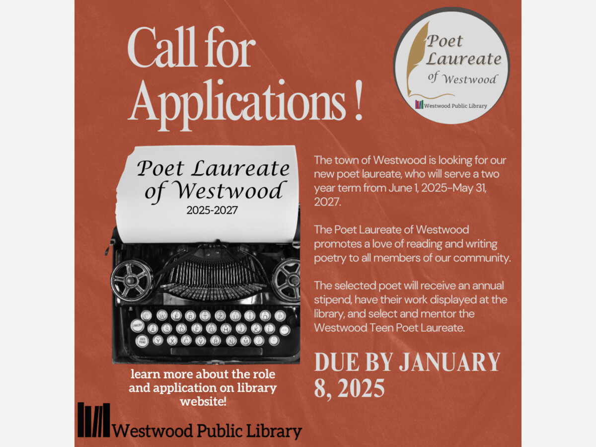 January 8, 2025, is the deadline for applications to be the next Poet Laureate of Westwood. This honorary position requires a love of poetry and the writing of poetry and the desire to spread an appreciation for the poetic art throughout the town of Westwood, through poetry events, publication of original poems on the Westwood Library website, poetry workshops and readings at the Westwood library and in the schools, and original occasional poems for town holidays such as Memorial Day, town Founding Day, Westwood Day, and Veteran's Day.