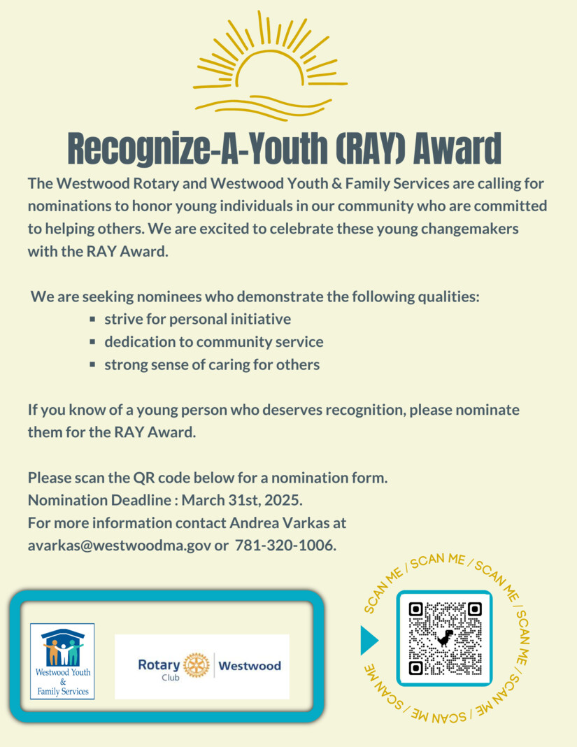 The Westwood Rotary and Westwood Youth & Family Services Department (WY&FS) are calling for nominations to honor young individuals in our community who are dedicated to helping others. The organizations will be celebrating young changemakers with their presentation of the annual RAY (Recognize-A-Youth) Award.