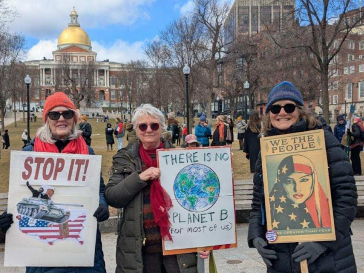 Photo by Claire Galkowski. Demonstrators at the Women's Day march in Boston on March 8, 2025 carried signs with varying messages expressing not only women empowerment, but rejection of fascism, criticism of current political leadership, and advocacy for the environment.Thanks to Claire Galkowski, Maria Costantini, Marilyn Bogue and Janice Wright for sharing their memorable moment with Westwood Minute.