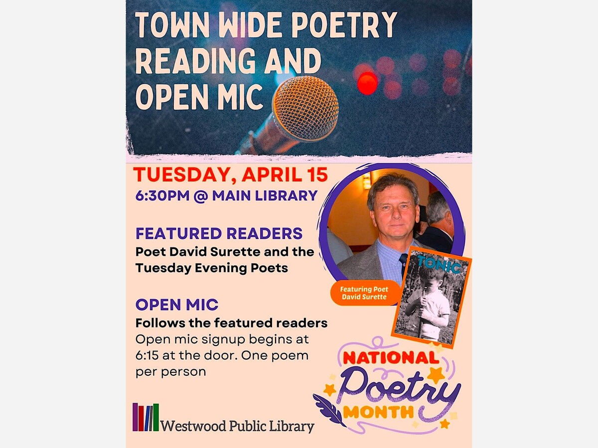 The third Annual Town-Wide Poetry Reading & Open Mic will take place Tuesday, April 15, 6:30 – 8 PM, at the Westwood Public Library, 660 High Street, Westwood. Poet David Surette, author of eight poetry collections, will be featured reader, along with members of the Westwood Library Tuesday Evening poets, youth Poet Laureate Elizabeth Lowney, and the next Westwood Poet Laureate Beth Swinning. Westwood Poet Laureate Lynne Viti will emcee the program