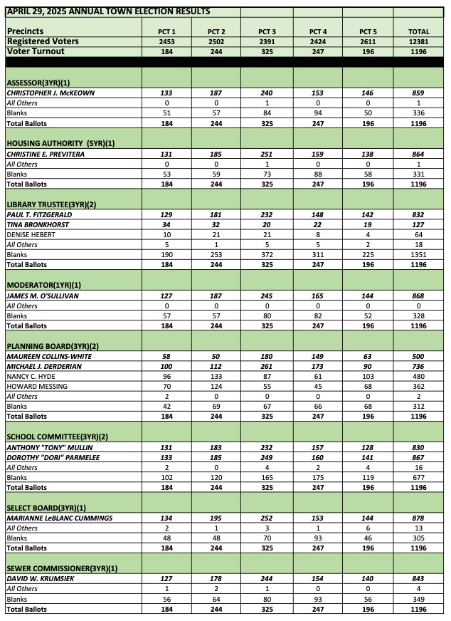 Image capture from Town of Westwood website, Current Election Information (April 29, 2025 Annual Town Election Results). This table from the Westwood Town Clerk's office shows how Precincts 1, 2, 3, 4, and 5 voted in Westwood's April Town Election.