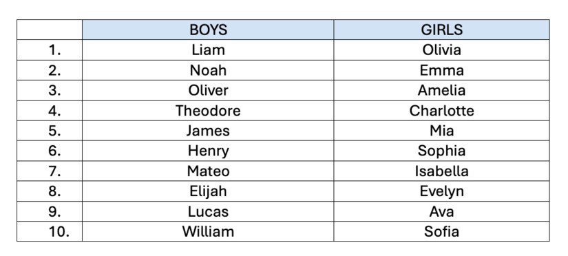 The most popular baby names for 2024 were Liam and Olivia, announced the Social Security Administration (SSA) on May 9, 2025, in continuing the agency’s tradition of marking Mother’s Day by announcing the 1,000 most popular baby’s names.