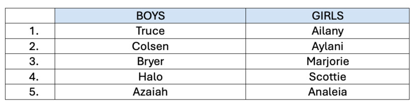 Social Security began compiling the baby name list in 1997, with names dating back to 1880. Along with compiling the 1,000 most popular names, SSA tracks the names that have increased the most in popularity. In 2024, Ailany, which means ‘chief’, topped the list of girls’ names that have increased the most in popularity. For boys, the name that topped the list was Truce, which means ‘peace.’ Truce rose 11,118 spots from its position on the 2023 list, cracking the top 1,000 at number 991 overall.