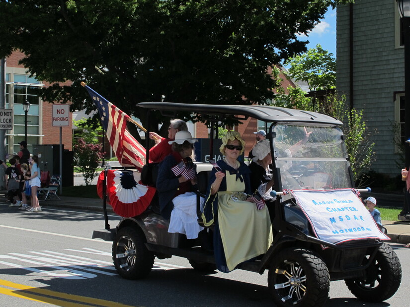 Photo by Westwood Minute/Madeleine Mulligan.Members of the Aaron Guild Chapter of the National Society Daughters of the American Revolution rode down High Street in their own cart. Waving a Betsy Ross flag from the back, the members handed out miniature American flags to kids running up to say hello.