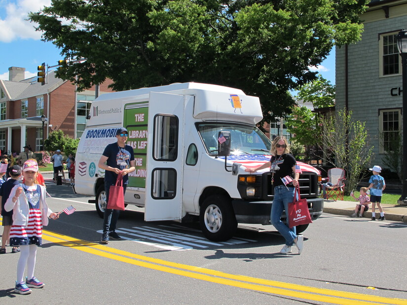 Photo by Westwood Minute/Madeleine Mulligan.Library Director Elizabeth McGovern posed with the Westwood Public Library Bookmobile, the library’s newest way of bringing reading to Westwood residents. McGovern and Assistant Library Director Andy Northrup threw out candy to the mass of kids giddily watching the parade.