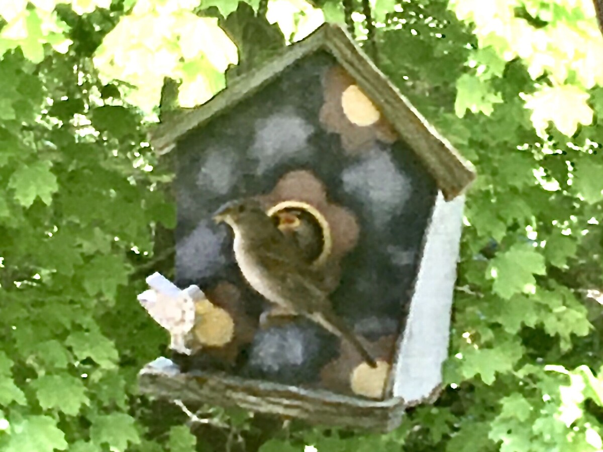 This hanging birdhouse has been home to many different sparrow families in my garden over the last several years. This picture was luckily taken on Saturday, May 15, 2021. The baby pictured here was one of a brood that flew the nest the very next day.