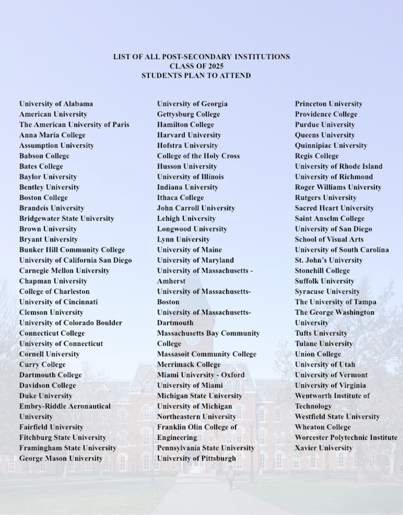 Graphic by Westwood Minute/Darlene Wong Cancell. List of all post-secondary institutions that members of the Westwood High School Class of 2025 plan to attend.
