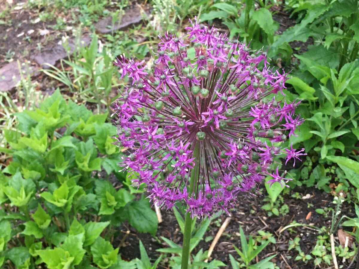 This is Allium, or ornamental onion. It grows several feet tall, and several inches across, and looks bigger and better each year that it comes back.
