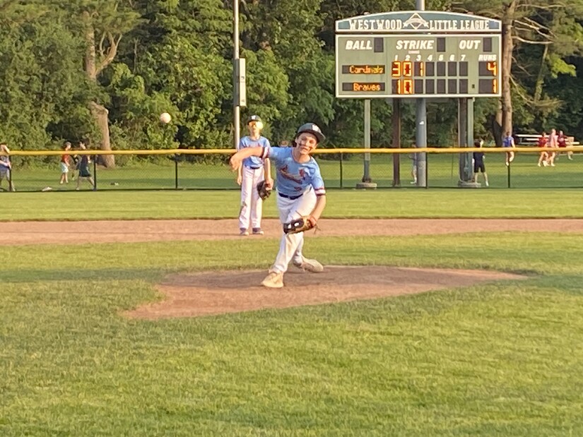 Photo by Westwood Minute/Darlene Wong Cancell. Miles McVay throws the final strike that ends the game and gives the Cardinals the win over the Braves.After the championship game is played, there is another chance for a few more swings at the bat as Little Leaguers. A select few, chosen from each majors team, compete in the Home Run Derby. The playing field is set up, with some adjustments being made for the young hitters. The batter will stand at what is normally the pitcher's mound, and will try to connect with pitches delivered by a Westwood High School baseball player, who is stationed some yards away, between the batter and the outfield. The goal is to send each ball sailing over the outfield's chain link fence - into home run territory. Any hit or swing that does not result in such a "home run" is considered an "out." Each batter gets three outs. Whomever hits the most home runs is the Home Derby champion.