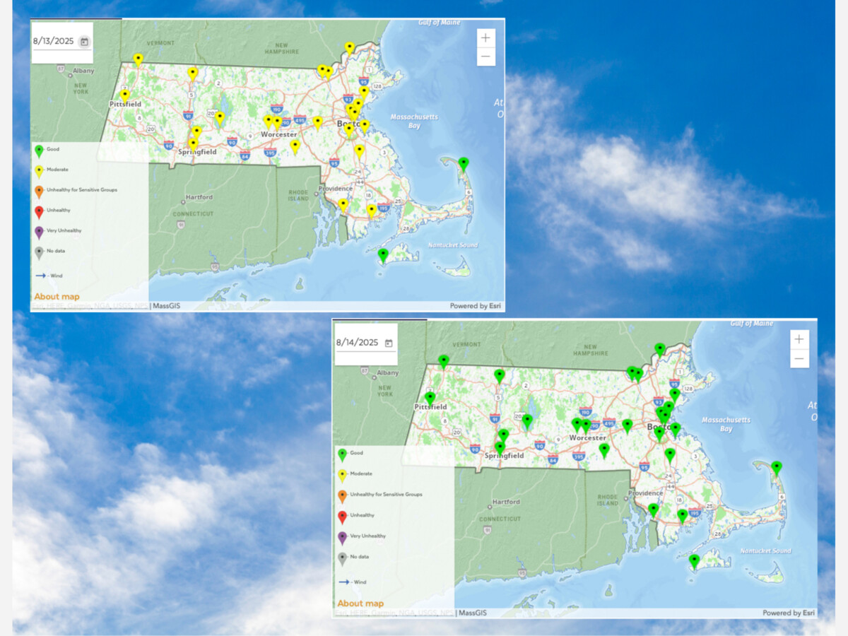 Data from MassAir Online shows that from the end of July through Wednesday, August 13th, the local area air quality has usually been in the "moderate" or "unhealthy for sensitive individuals" range.