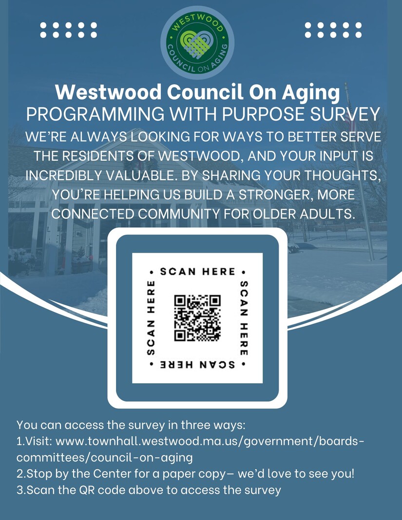 Through October 31st, the Westwood Council on Aging is accepting feedback on is Programing with a Purpose survey, in hopes to better serve the residents of Westwood and build a stronger, more connected community for older adults.