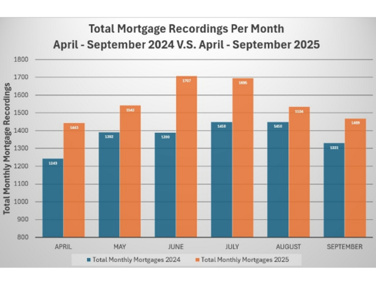 In addition to increased deed recordings, lending activity also saw growth. A total of 1,469 mortgages were recorded in September 2025, up 10% from September 2024, though down 4% from August 2025. The total dollar amount of mortgage indebtedness recorded in September was $1,286,464,631, a 61% increase compared to the $797,674,694 recorded in September 2024.