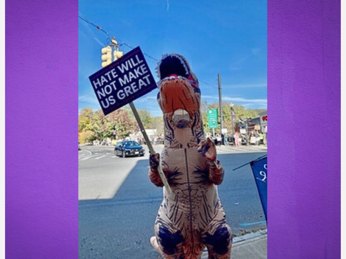 I was surprised and happy to see that a large group of people had gathered in the center of town. There were people of all ages. There were wonderful, creative signs. Folks in costume. The dragon was adorable. People were friendly, peaceful, engaged. And a pretty high percentage of cars driving through the center of town acknowledged us with horn blowing and friendly waves.