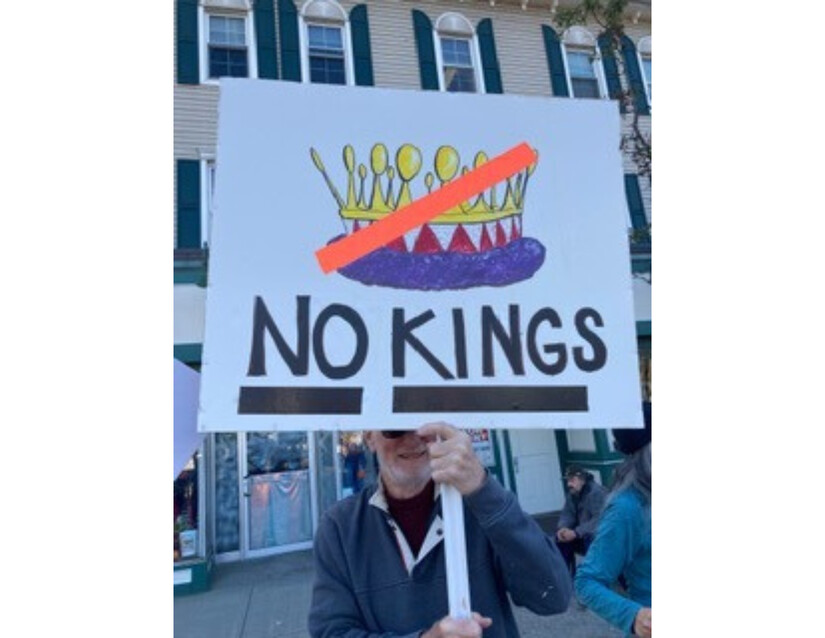 Photo by Connie Rizoli. A protestor at a No Kings gathering in Palmer, MA on October 18, 2025 displays a sign with a picture of a crown crossed out and the words, "NO KINGS."At some point, I started chatting with a young man. Although I didn’t notice his Charlie Kirk hat right away, he quickly acknowledged that he was a Republican from Palmer who decided to come to the center of town to see what was going on. For about the next hour we engaged in thoughtful, respectful conversation. It was obvious that we disagreed on a lot, but it was also obvious that we agreed on a lot as well.