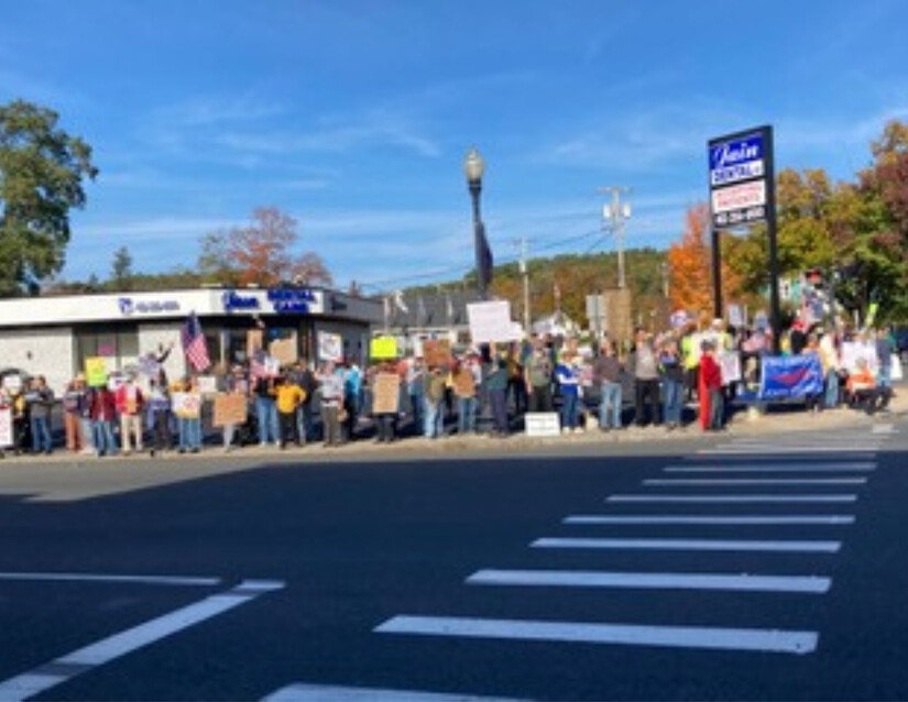 Photo by Connie Rizoli. A crowd of protesters line a street in Palmer, MA on October 18, 2025, at of the many nationwide No Kings gatherings on that day.At this point, a demonstrator noticed the Charlie Kirk cap and proceeded to hurl insults at the young man. At another point, two counter-demonstrators approached us, sarcastically asking what we wanted out of the demonstration.