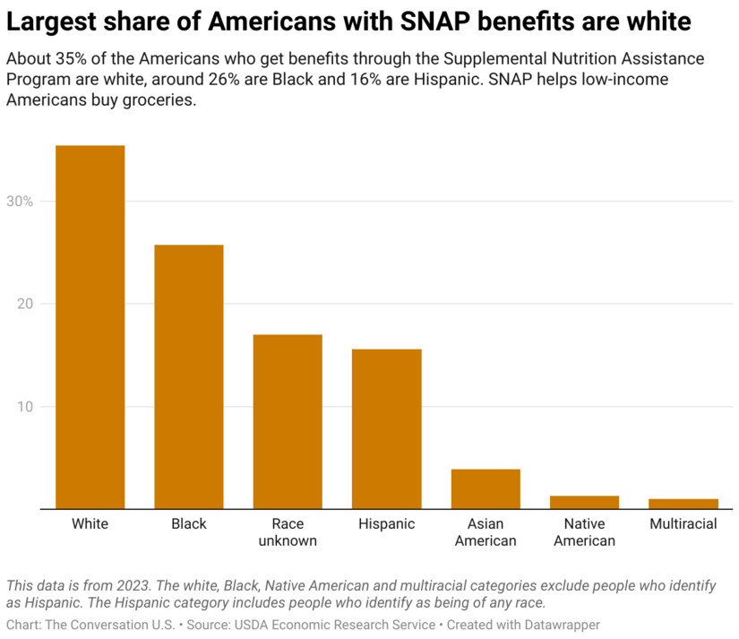 A little over 35% of people who get SNAP benefits are white, more than any other racial or ethnic group. Around 26% are Black and 16% are Hispanic.