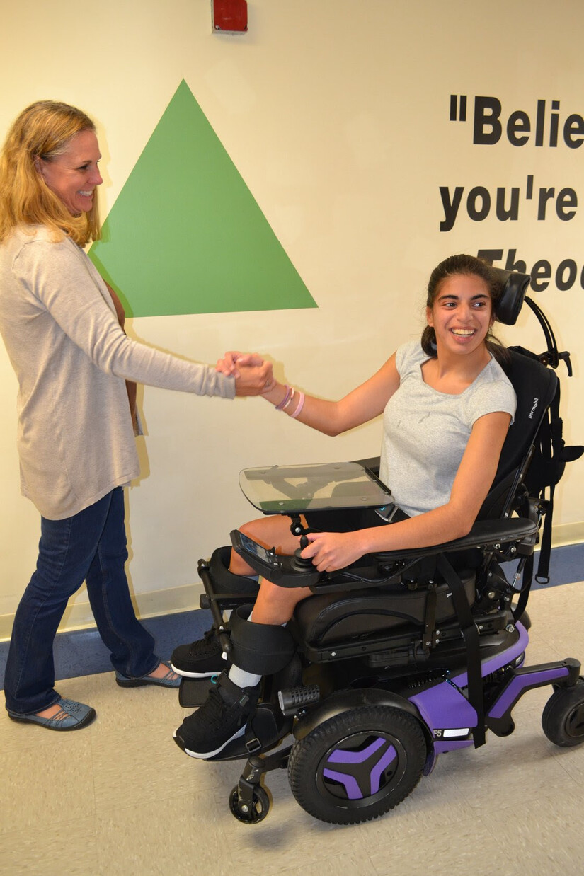 Photo courtesy of Massachusetts Organization of Educational Collaboratives. TEC Campus School Program Director Meredith L. Faletra greets Trinity Elias, 18, of Norwood, who wrote a poem about her purple power chair. Later that day, she cruised the TEC Campus School hallways in her purple power chair, waving to friends and fist-bumping staff.