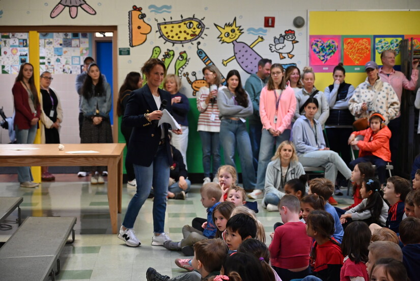 Photo courtesy of Meghan Walsh. Principal Kristen Evans (left of center, in blue) leads a gathering of Sheehan School students, staff, and families in the school cafeteria.Thanks to Meghan Walsh, a special education teacher at the Sheehan School of Westwood Public Schools, for contributing this article to Westwood Minute.