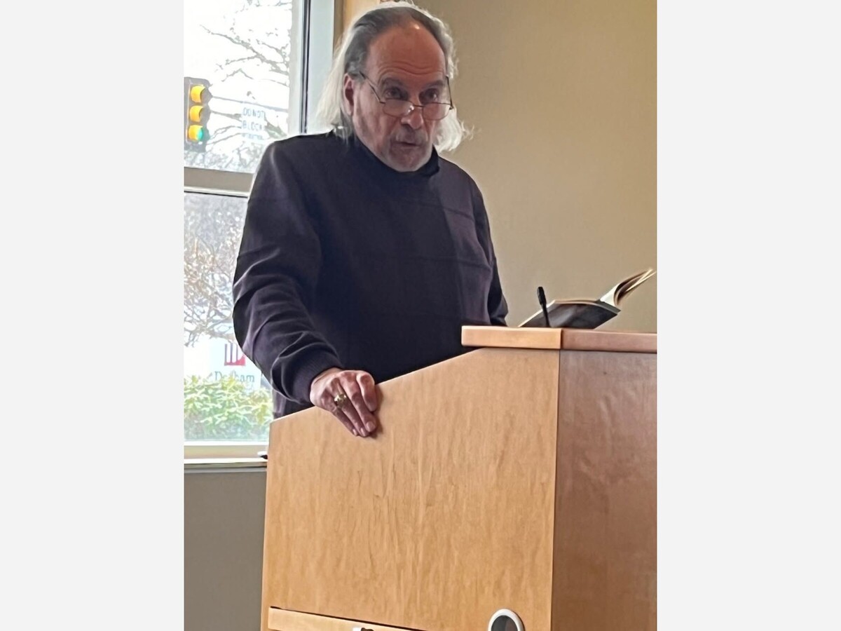 Photo by David Miller. Westwood resident Michael Dwyer reads his poem, "The Old Woman of Beare."The January 11 program continued that tradition, offering an evening that celebrated both the literary history of New England and the vibrant voices shaping its poetic future.