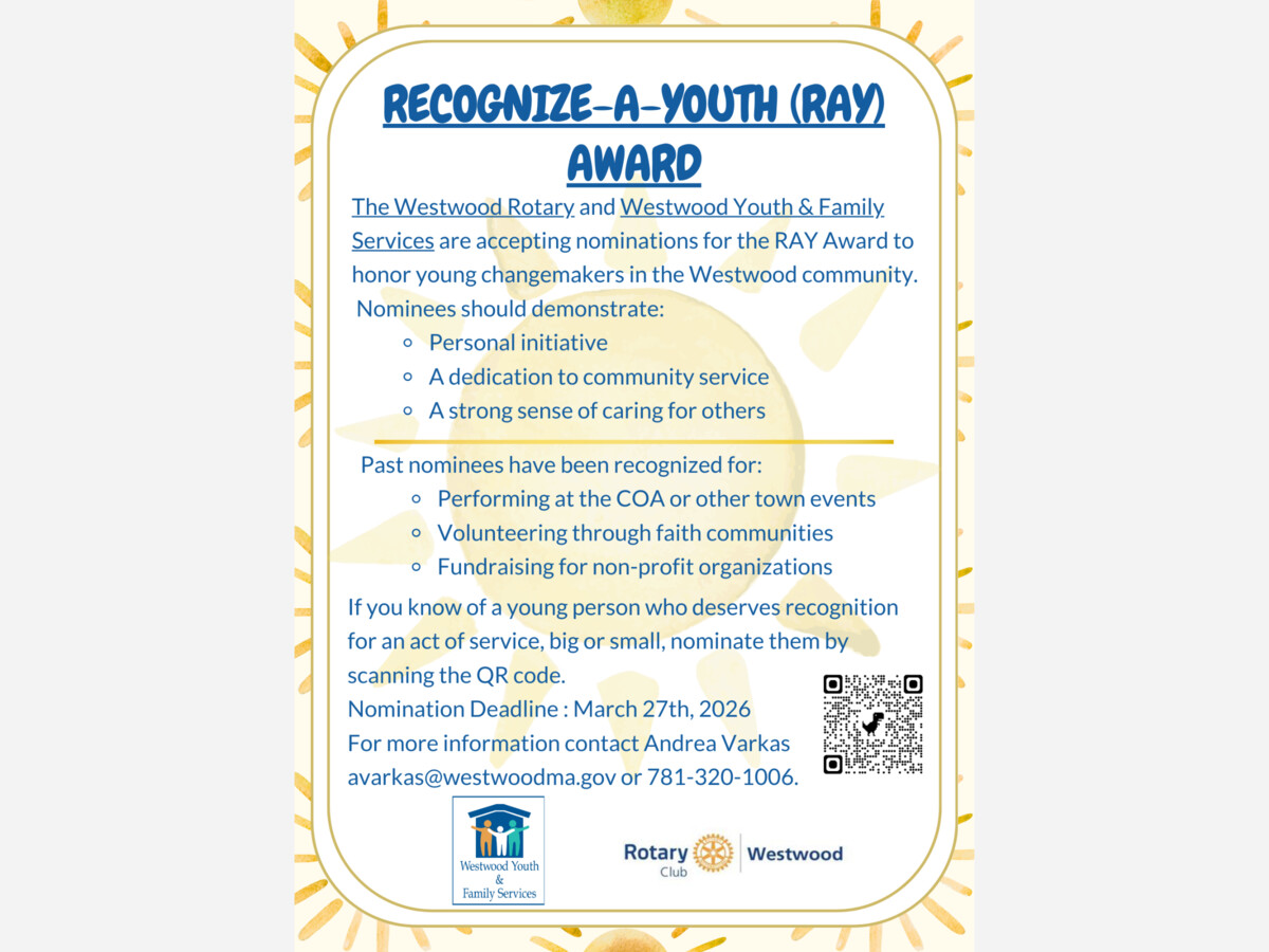 Nominations are being accepted from now through March 27th for the Recognize-A-Youth (RAY) Award, which honors young people in the community who demonstrate personal initiative, a commitment to community service, and a strong ethic of caring for others, Westwood Youth & Family Services announced this week.