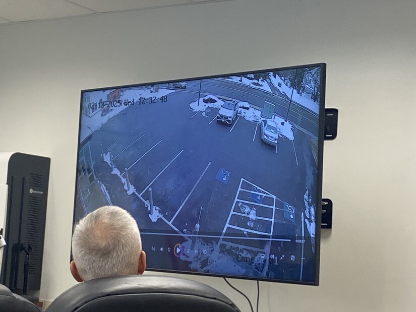 Photo by Westwood Minute/Darlene Wong Cancell. Bolton Police Chief Donald Murphy (standing) explains the events of February 12, 2025, as viewed on videotape, during the termination hearing for Officer Dominic Abatangelo on March 24, 2026.Chief Murphy testified that his main concern was keeping his eyes on the firearms. He knew the danger in a room where the parties were arguing with firearms present. He had his eyes focused on Officer Abbatangelo’s arm, but observed it was not retrieving his firearm, which stayed in its holster.