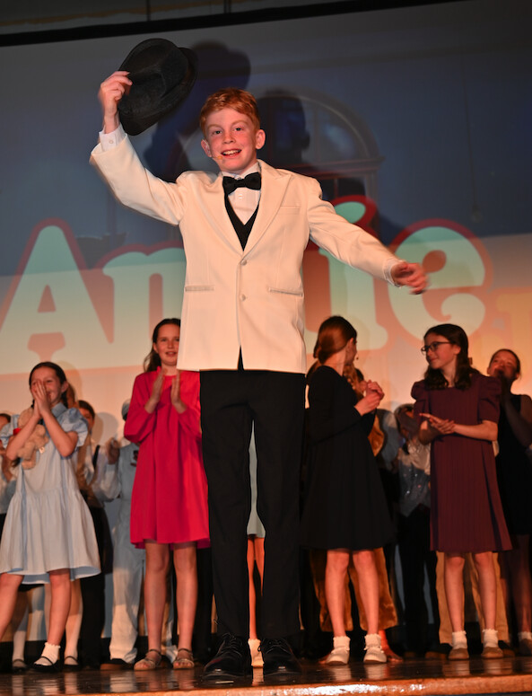 Photo courtesy of Megan Walsh. A Sheehan School student tips his hat in the student production of "Annie."The excitement surrounding the production extended far beyond the stage—so much so that all weekend performances were completely sold out, a true testament to the anticipation, pride, and support of the Sheehan community.