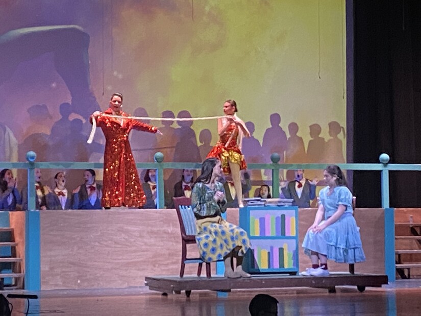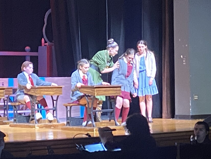 Photo by Westwood Minute/Darlene Wong Cancell. Miss Trunchbull (Audrey Fairbanks, left, in green) chastises Matilda (Emma Rocha) in the presence of her classmates and Miss Honey (Ella Causey).Directed by TMS drama teacher Gina Cosimini, the middle school's production of "Matilda" successfully creates a number of emotional arcs that keep the audience engaged with the story and connected to the characters.