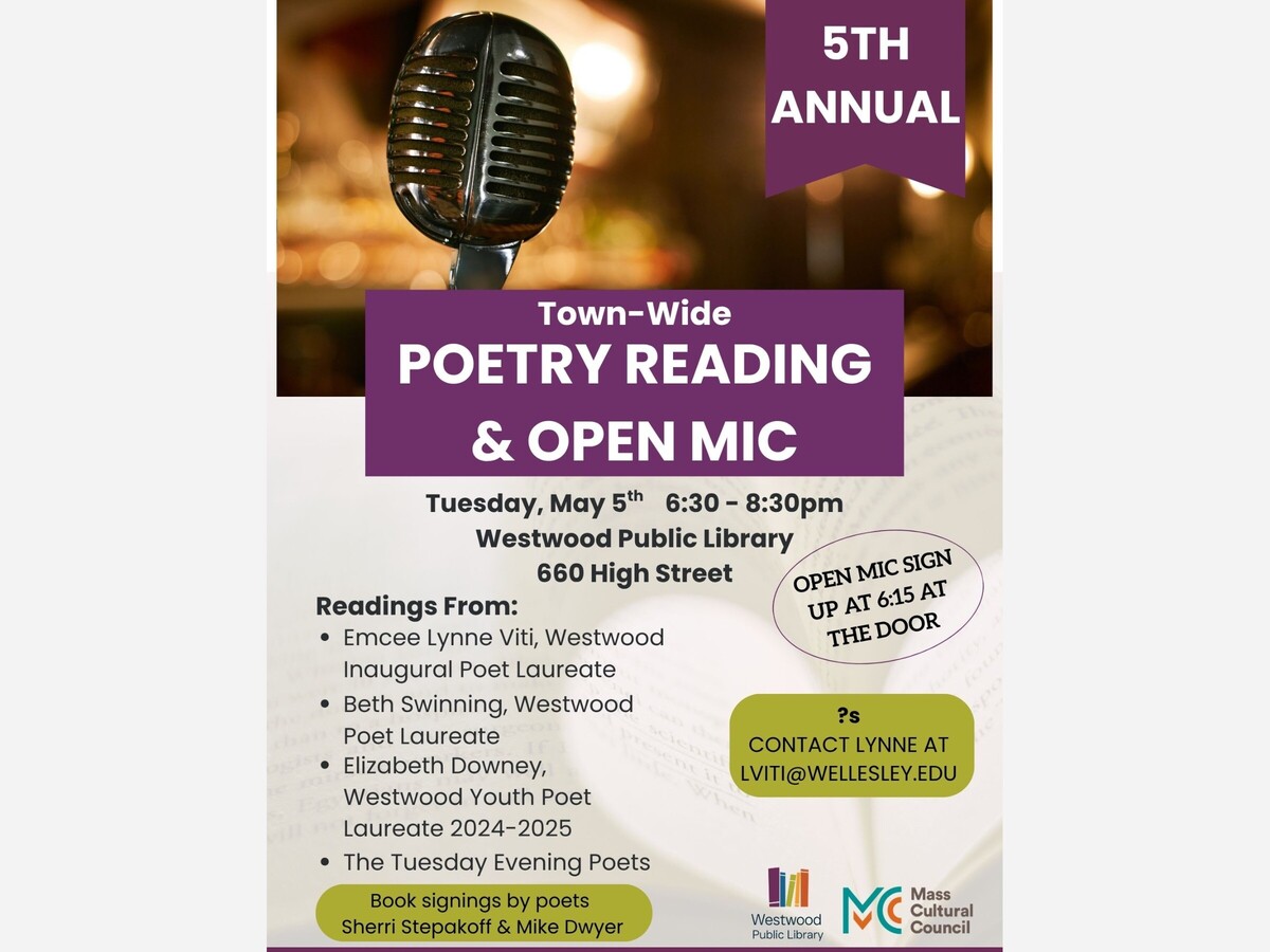The Westwood Public Library and Tuesday Evening Poets will present the fifth annual Poetry Reading and Open Mic at the main Westwood Library, 660 High Street, on Tuesday, May 5, 6:30 PM. Featured readers are Westwood Poet Laureate Beth Swinning, Youth Poet Laureate emerita Elizabeth Lowney, and Westwood Tuesday Evening Poets Jan Brogan, Mike Dwyer, Marilyn Gove, Karen Michelson, Sherri Stepakoff and Debra David.