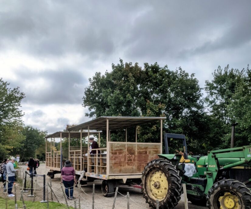 Photo courtesy of Ward's Berry Farm. Tractor ride at the farm.After trying your luck in the corn maze, exit to the nearby pumpkin patch to pick your pumpkin. Carving pumpkins are 85 cents per pound. White and yellow varieties are also available at $1 per pound.